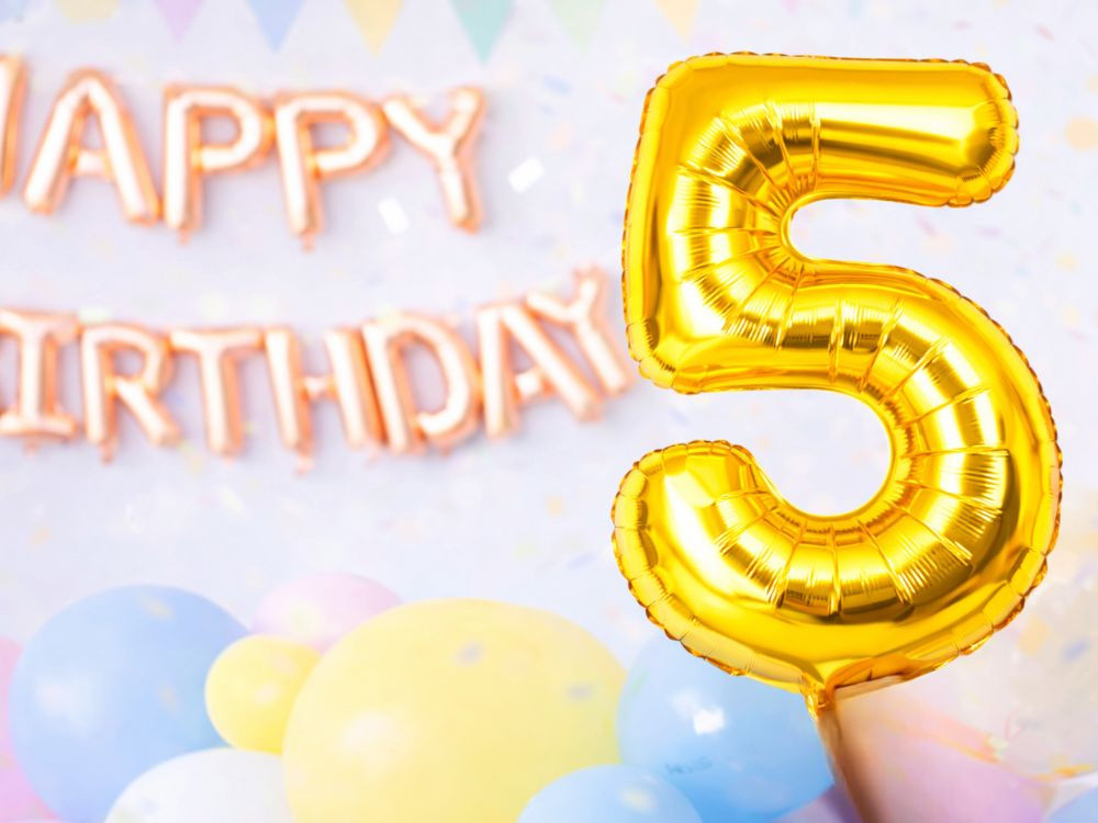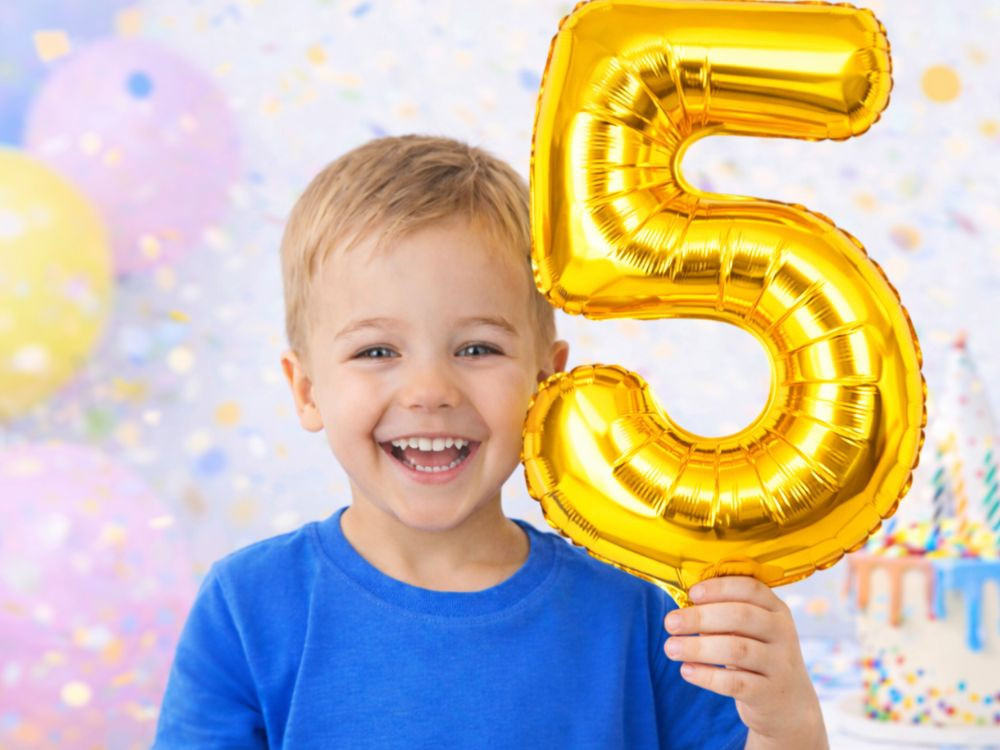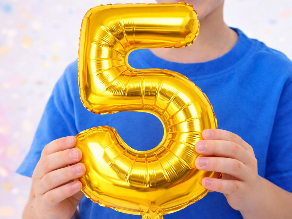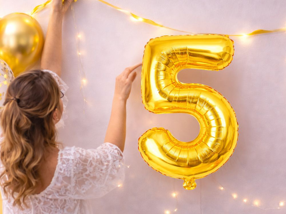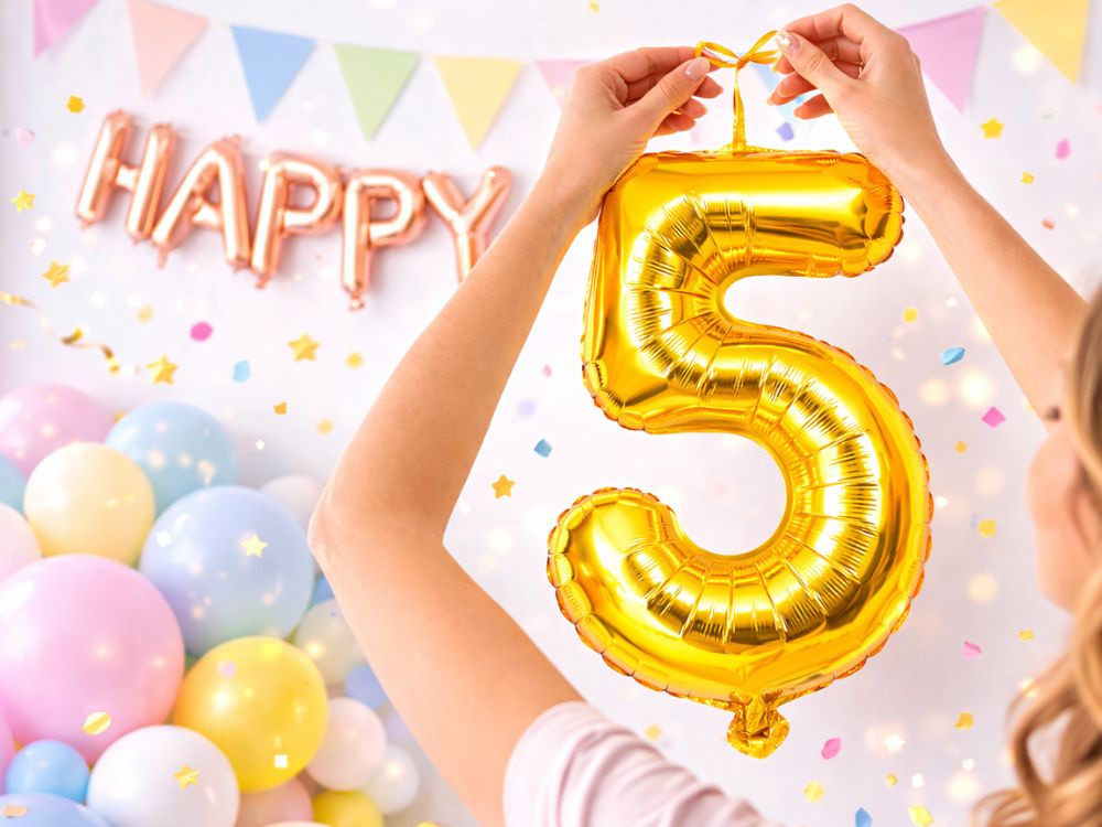 Szám alakú lufikkal, például arany 5-ös lufival.