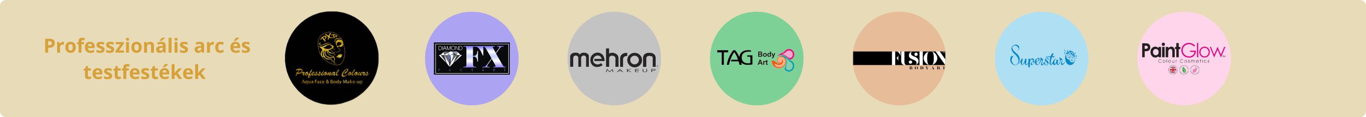 Webáruházunkban megtalálható több arcfesték világmárka, mint például Fusion, Diamond FX, Mehron, PXP, Superstar, Grimas, Eulenspiegel, Paint Glow többféle kiszerelésben, paletták, ecsetek, szivacsok, kiegészítők és professzionális kellékek nagy választékban.