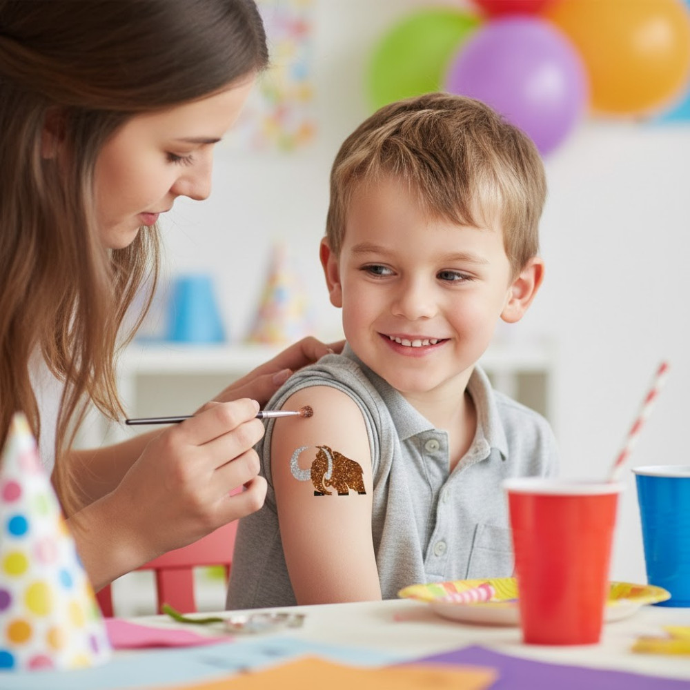 Felragasztod → testragasztó → csillámpor vagy festék → kész a látványos mamutos tetoválás.