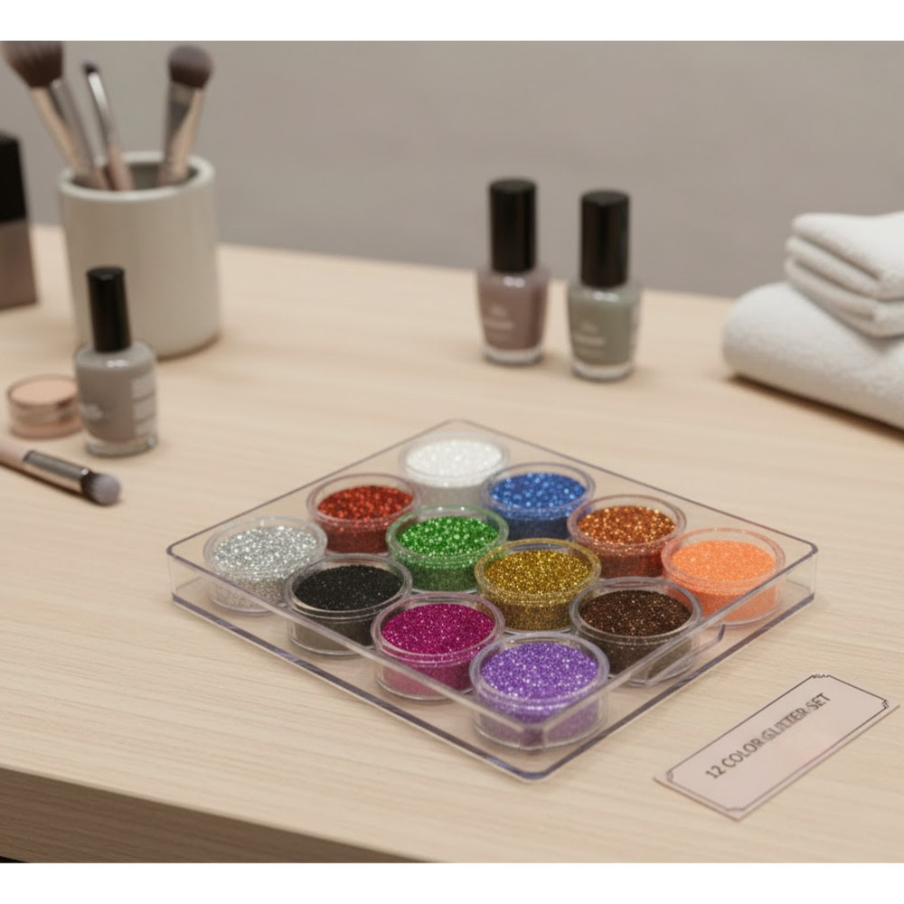 A készlet 12 eltérő, klasszikus színárnyalatú csillámport tartalmaz, amelyek könnyen kombinálhatók egymással és más kozmetikai termékekkel.