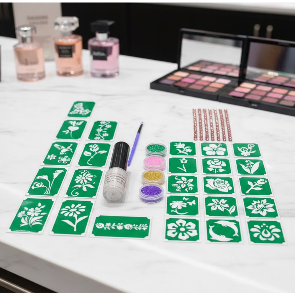 Virágos mintájú csillámtetoválás készlet, amely tökéletes választás minden kreatív alkotáshoz. A szett csillogó színekkel, bőrbarát ragasztóval és strasszkövekkel segít igazán látványos glitter tetoválások készítésében.