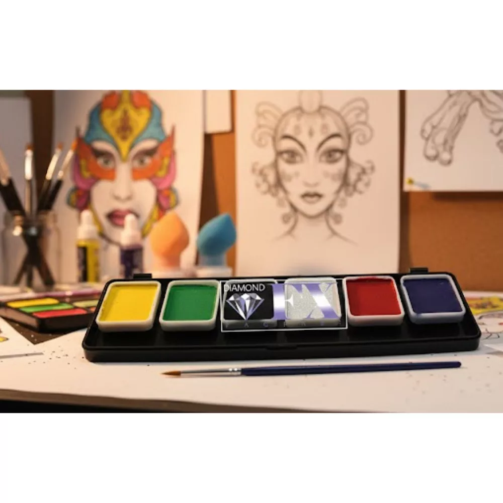 Ez a Diamond FX 6 Színű Arcfesték Készlet – Alap Színek nem csupán festékeket tartalmaz, hanem a kulcsot a gyors, precíz és lenyűgöző, professzionális arcfestések megalkotásához, kényelmes, kompakt méretben. Légy te a sminkes, aki a művészetet hozza el az arcokra, már az első ecsetvonástól!