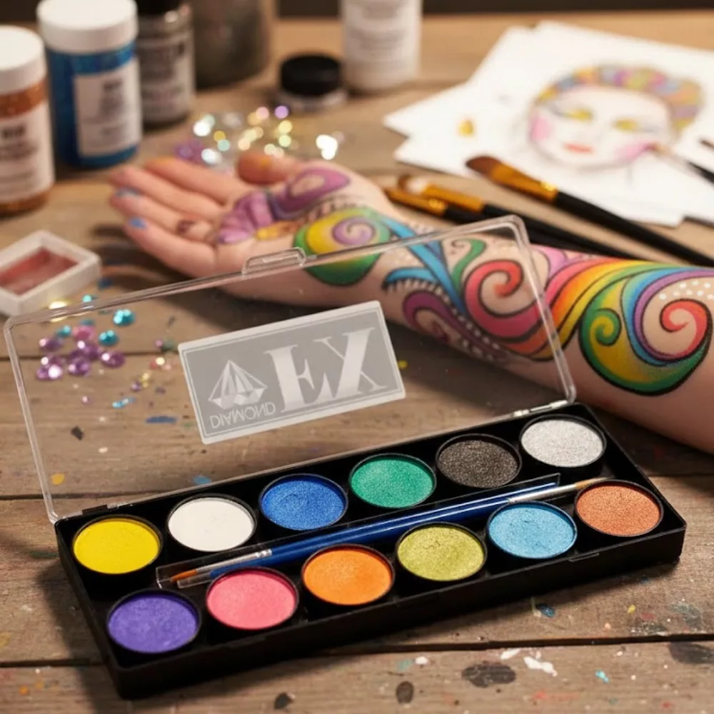 A Diamond FX arc és testfestékek viasz alapú, vízzel könnyen alktiválható, tökéletes fedési tulajdonságokkal és magas pigmenttartalommal rendelkeznek.