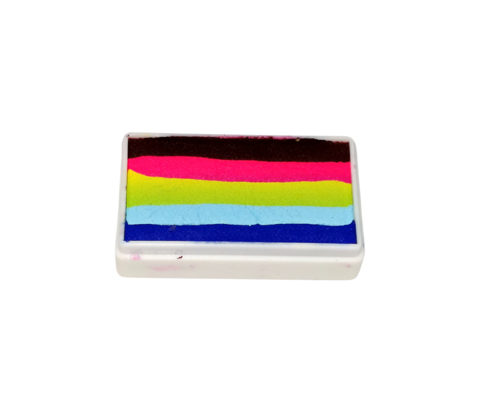 Ez egy professzionális, 28 grammos, préselt, vízbázisú, csíkos arcfesték blokk. A "Bright Rainbow" (Élénk Szivárvány) elnevezés a szivárvány összes fő színének (piros, narancs, sárga, zöld, kék, lila) kombinációját jelenti, gondosan összeválogatva. Ez a festékblokk több, gondosan összeválogatott, élénk színsávból áll, amelyek tökéletesen egymásba olvadva felelnek a klasszikus szivárvány hatásért.