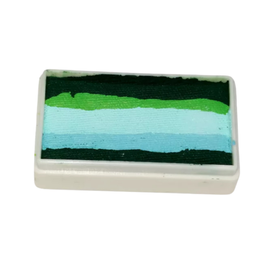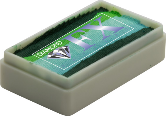 A Diamond FX a világ egyik legismertebb és legelismertebb arcfesték márkája. A "csíkos festék" (más néven "split cake" vagy "rainbow cake") termékei forradalmasították az arcfestést, lehetővé téve a gyors, de rendkívül látványos színátmenetek és minták elkészítését. A Garden Gnome árnyalat – a képen láthatóan – egy élénk, hűvös és harmonikus színösszeállítás, amely tökéletes sellő uszonyokhoz, tengeri hullámokhoz, dzsungel lombozathoz és tündér szárnyakhoz.