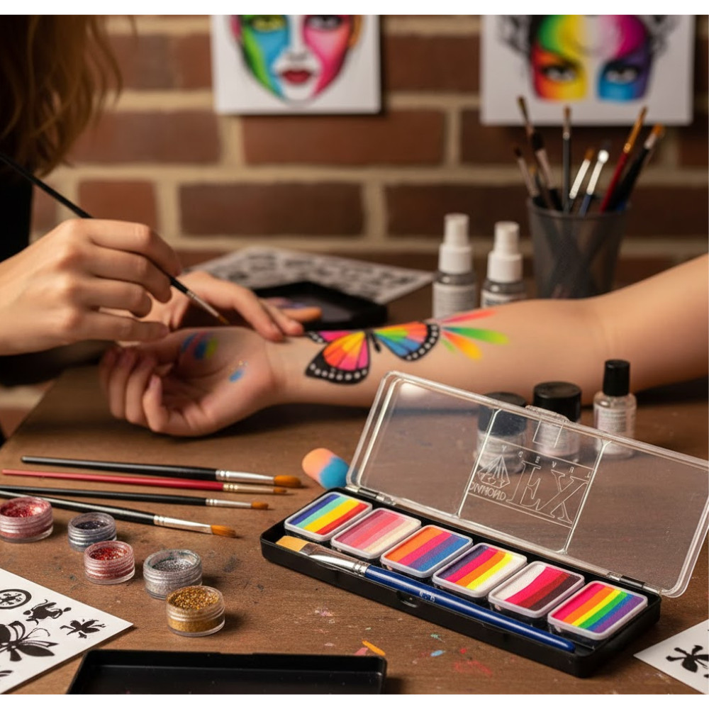 - "One Stroke" Technika: A paletta lényege az "egy mozdulat" (one stroke) technika. Egy lapos ecsetet áthúzva a festékblokkon, az ecset felveszi az összes színt, amit aztán egyetlen mozdulattal felvihetsz a bőrre, tökéletes színátmenettel.