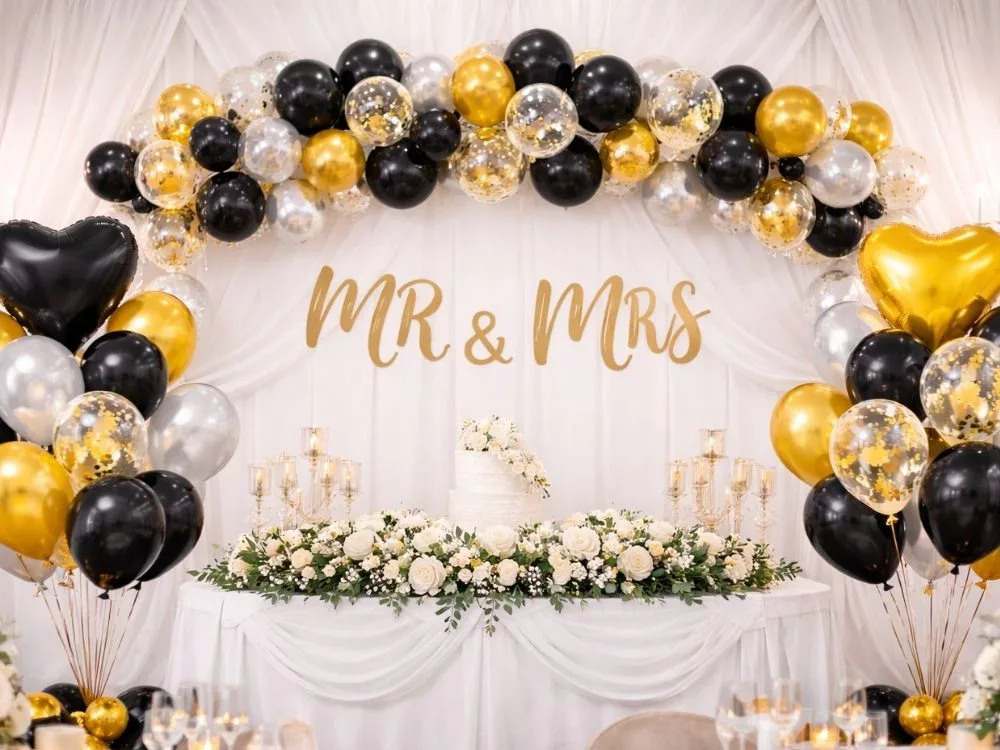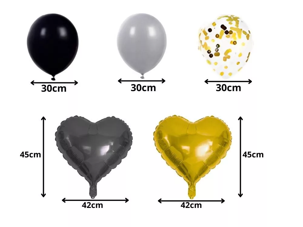 A fekete-arany konfettis és szív alakú lufikból álló szett modern és elegáns választás.