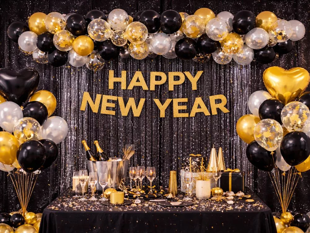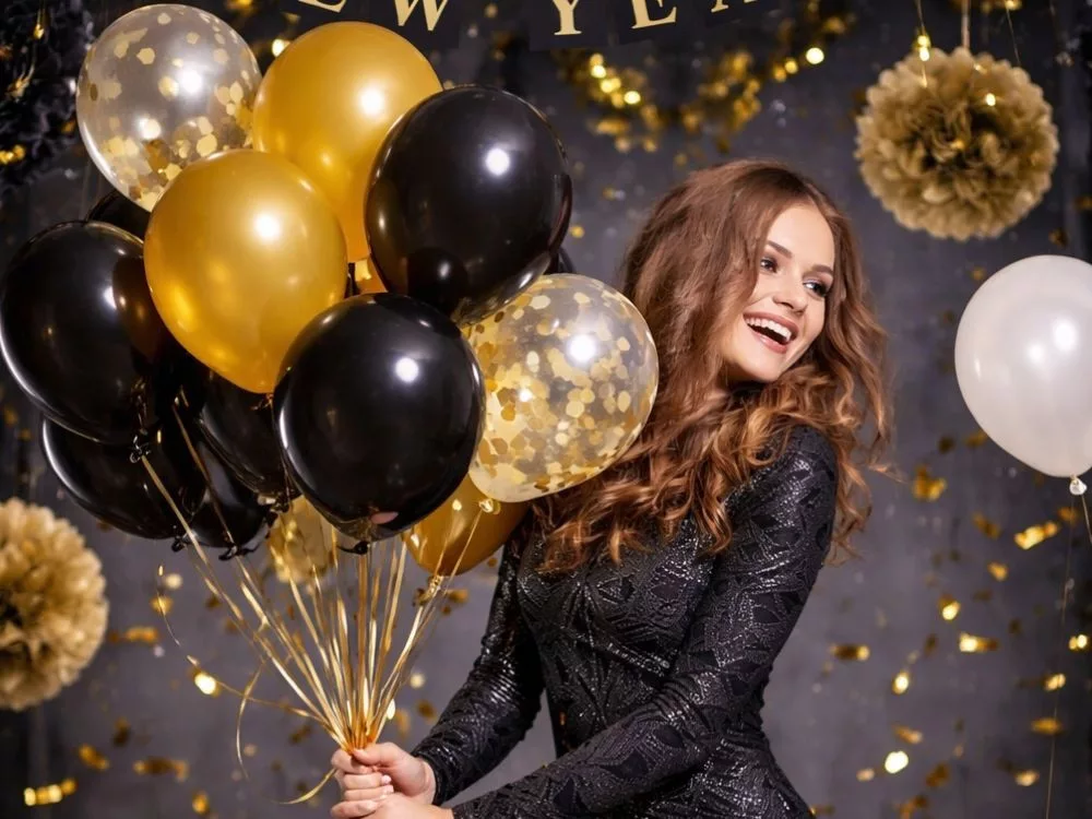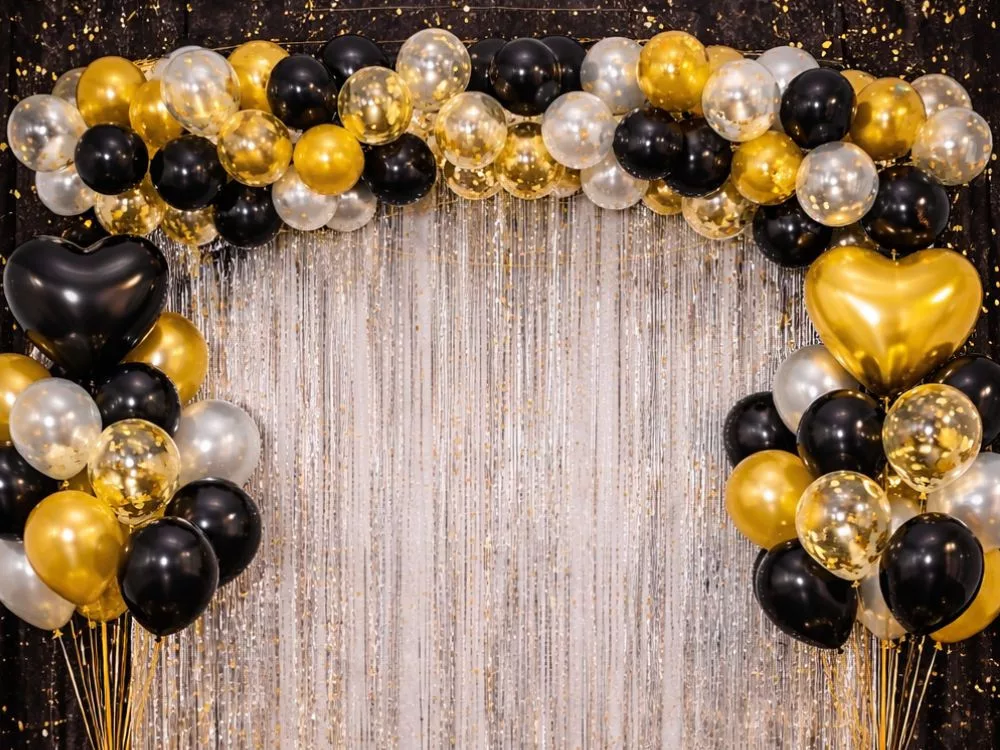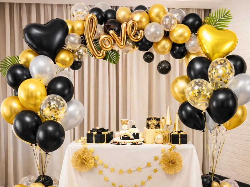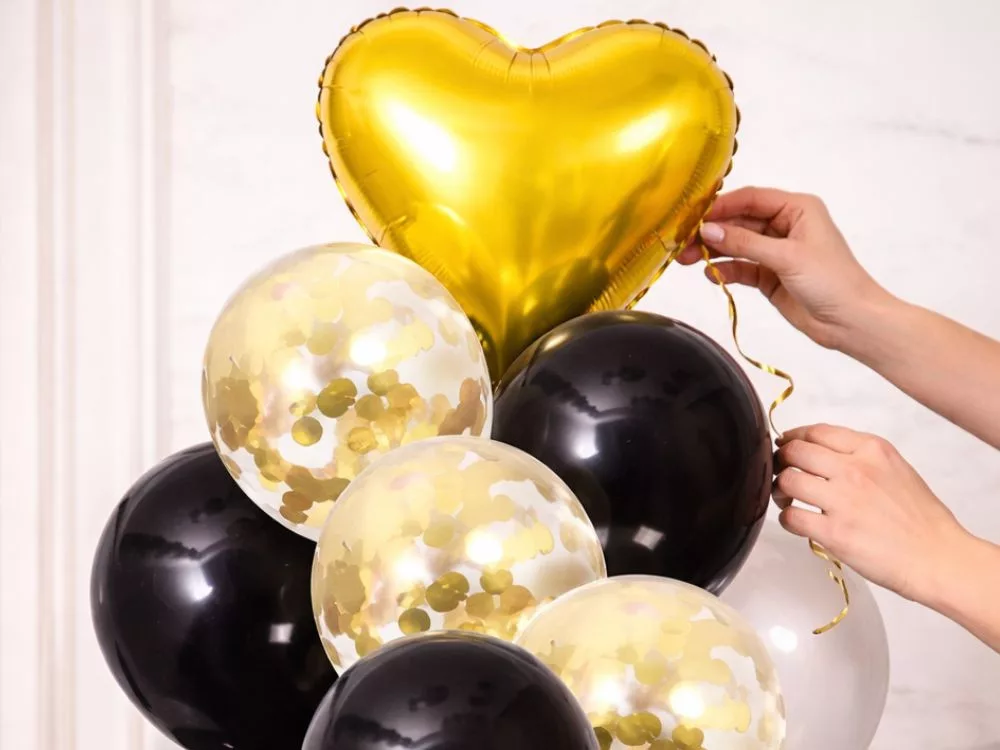 Konfettis, fényes és kontrasztos színű lufik, mint a fekete és arany kombináció.
