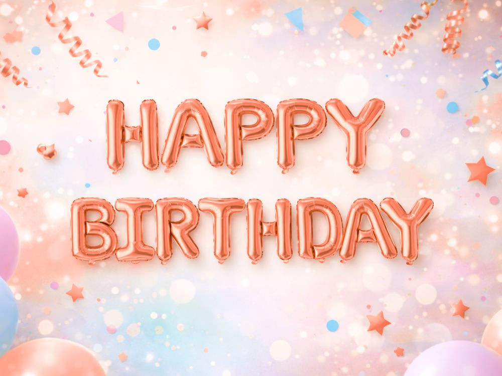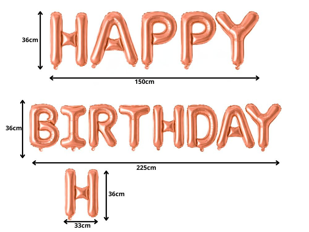 13 darab rózsaszín fólia betűlufit, amelyek együtt kiadják a „Happy Birthday” feliratot.