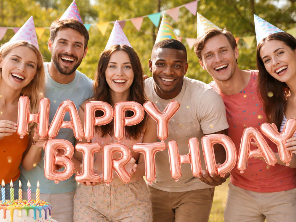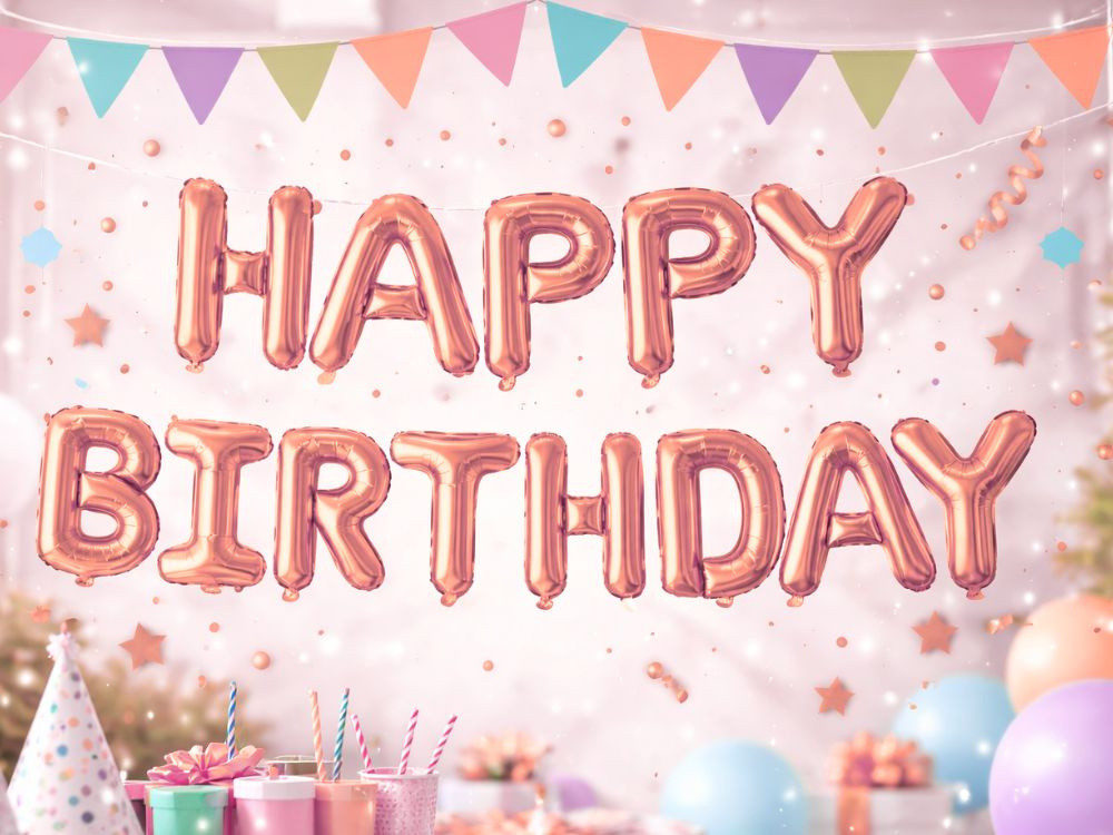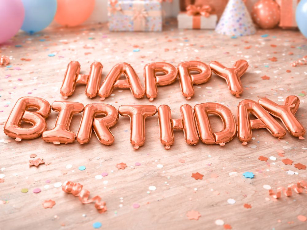 Egy nagy méretű „Happy Birthday” felirat fólia lufikból.