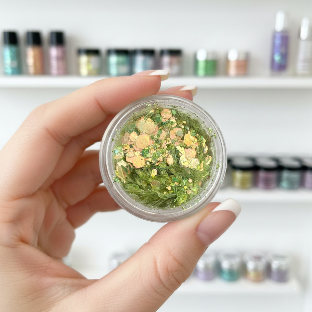 A KiviArt Aurora Mixed Chunky Csillám (XS13) egy különleges, prémium minőségű glitter keverék, amelyet a Sarki fény (Aurora Borealis) éteri, színváltós ragyogása inspirált. Ez a "Mixed Chunky" termék tökéletesen ötvözi a finom, szikrázó csillámport a nagyméretű, feltűnő "Chunky" flitterekkel. A XS13 kód egyedi, dominánsan kék, zöld, lila és irizáló fehér árnyalatokból álló mixet takar, ami a fény hatására dinamikusan változtatja a színét.