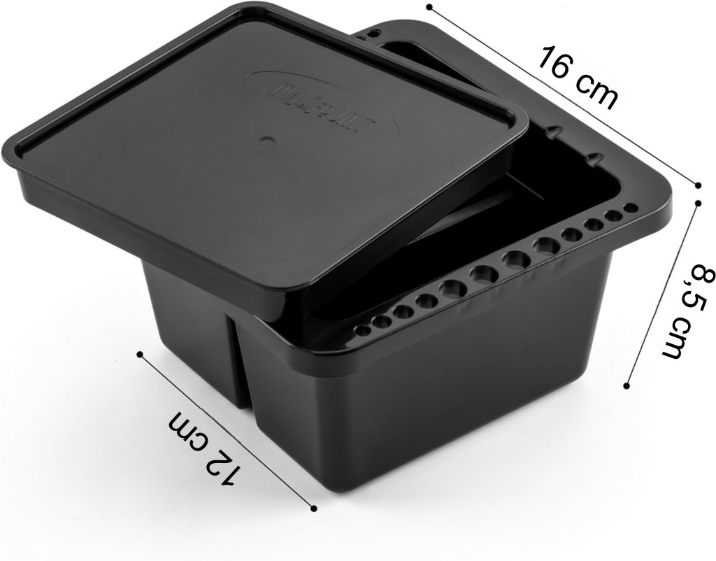 Egy rekeszes, bordázott tisztítófelületű és ecsettartó lyukakkal rendelkező fedeles ecsetmosó tál.