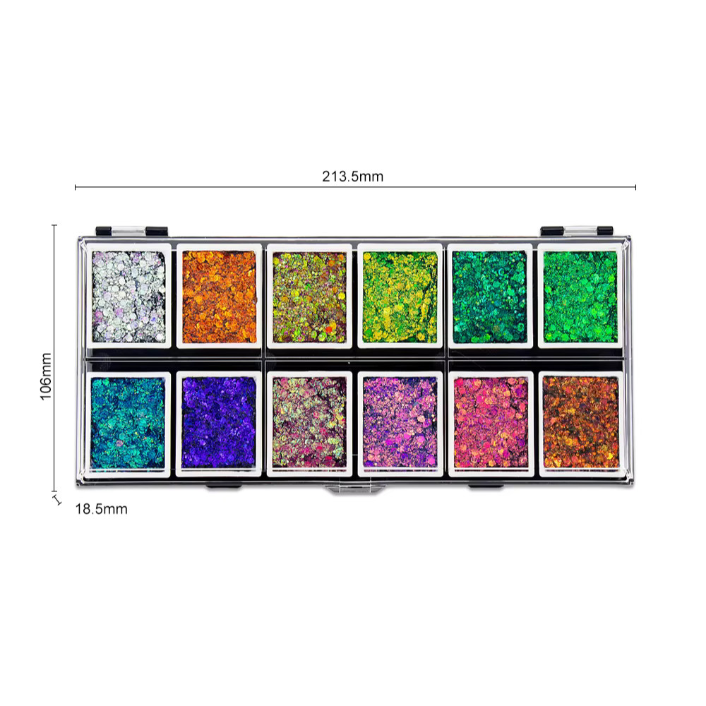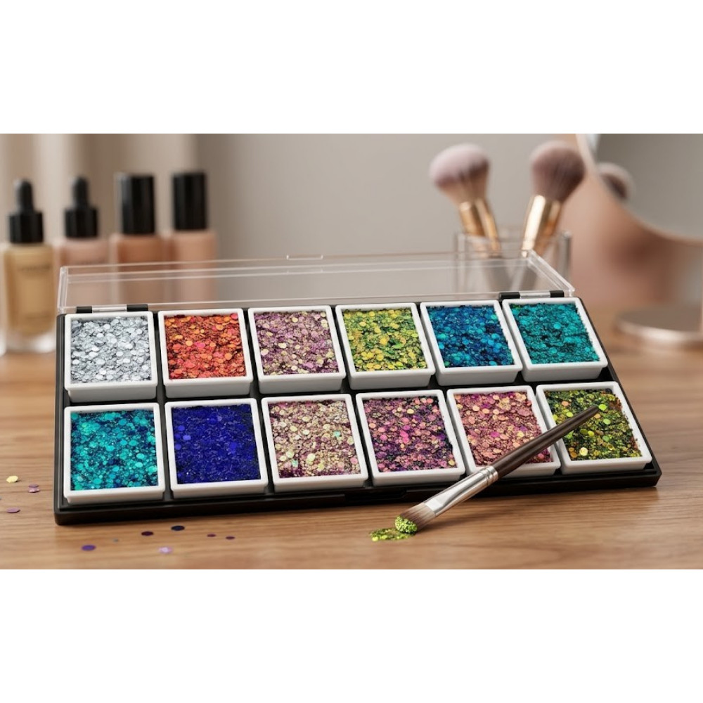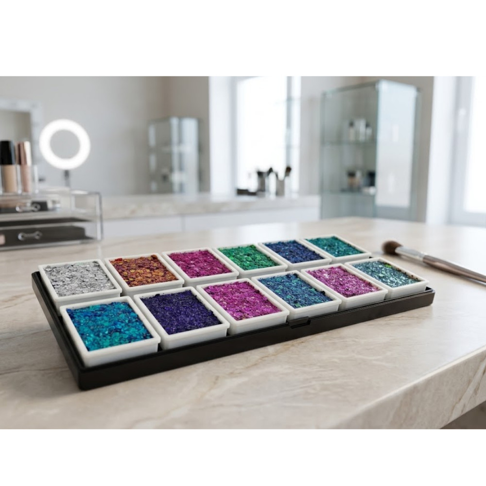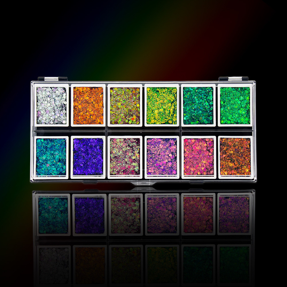 12 különböző, színjátszó glitter krémet, amelyek külön-külön és kombinálva is használhatók.