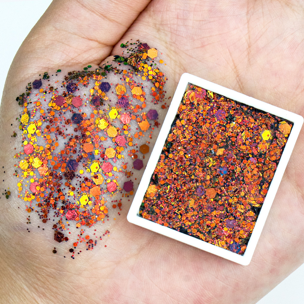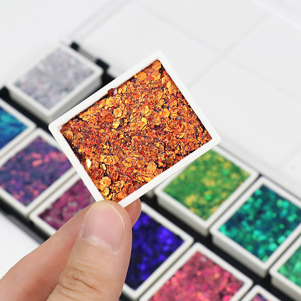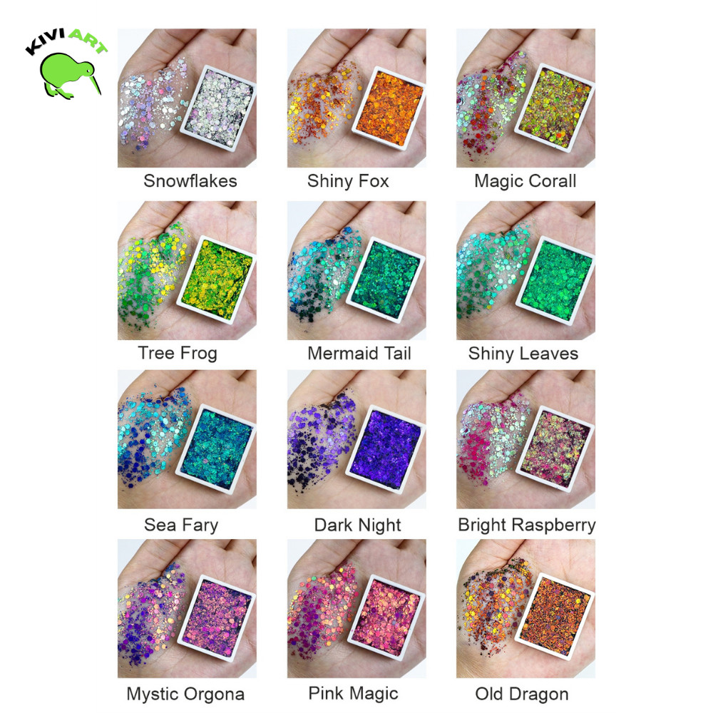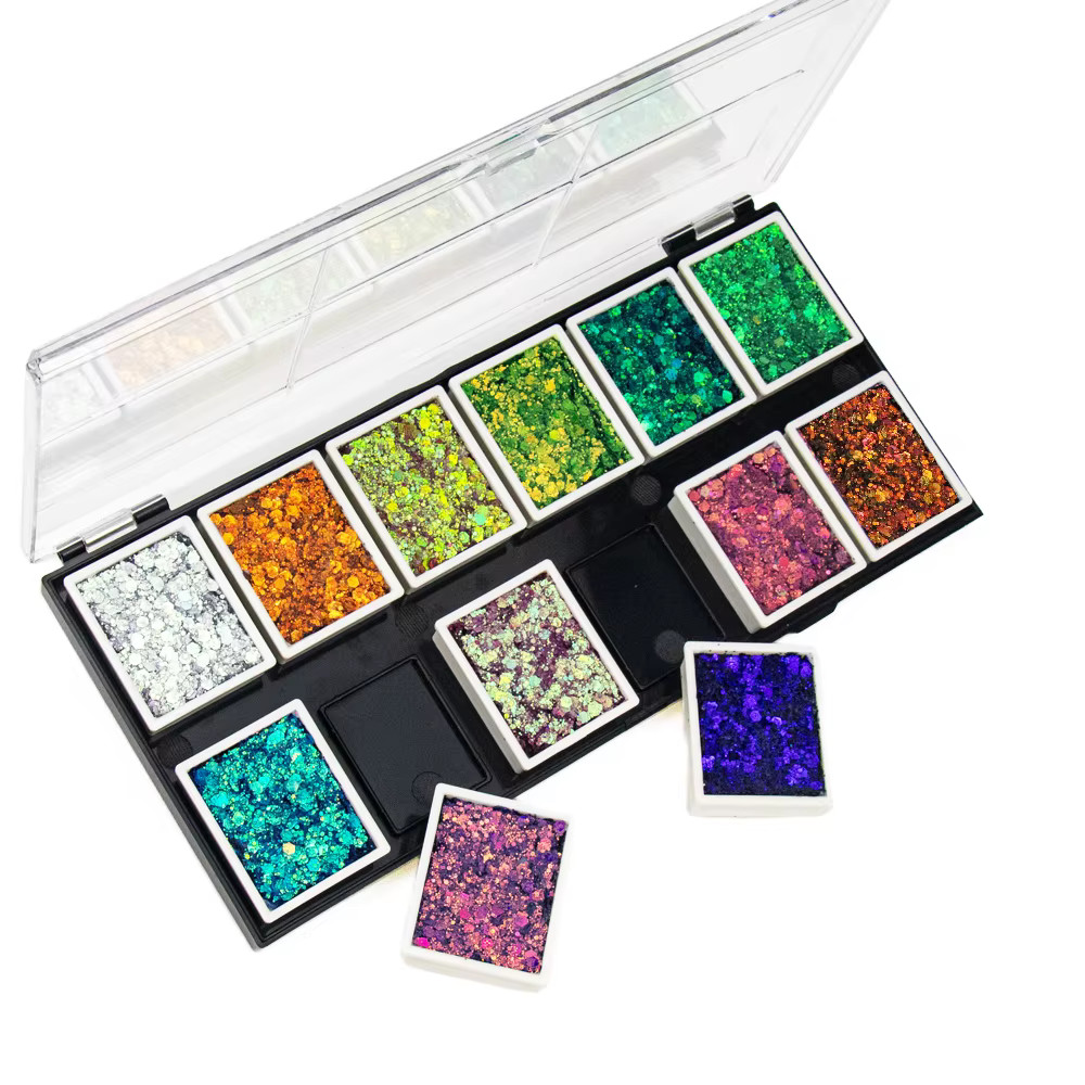 12 különböző, színjátszó glitter krémet, amelyek külön-külön és kombinálva is használhatók.