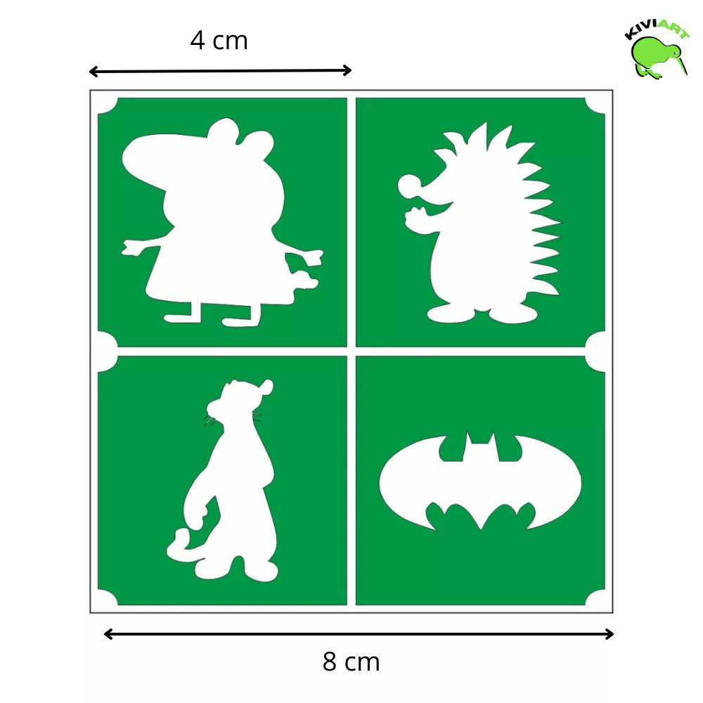 4 darabos öntapadó festősablon vegyes mintával. Csillámtetováláshoz, arc és testfestéshez, henna festéshez, illetve textil, vagy tárgyak díszítéséhez ajánljuk.