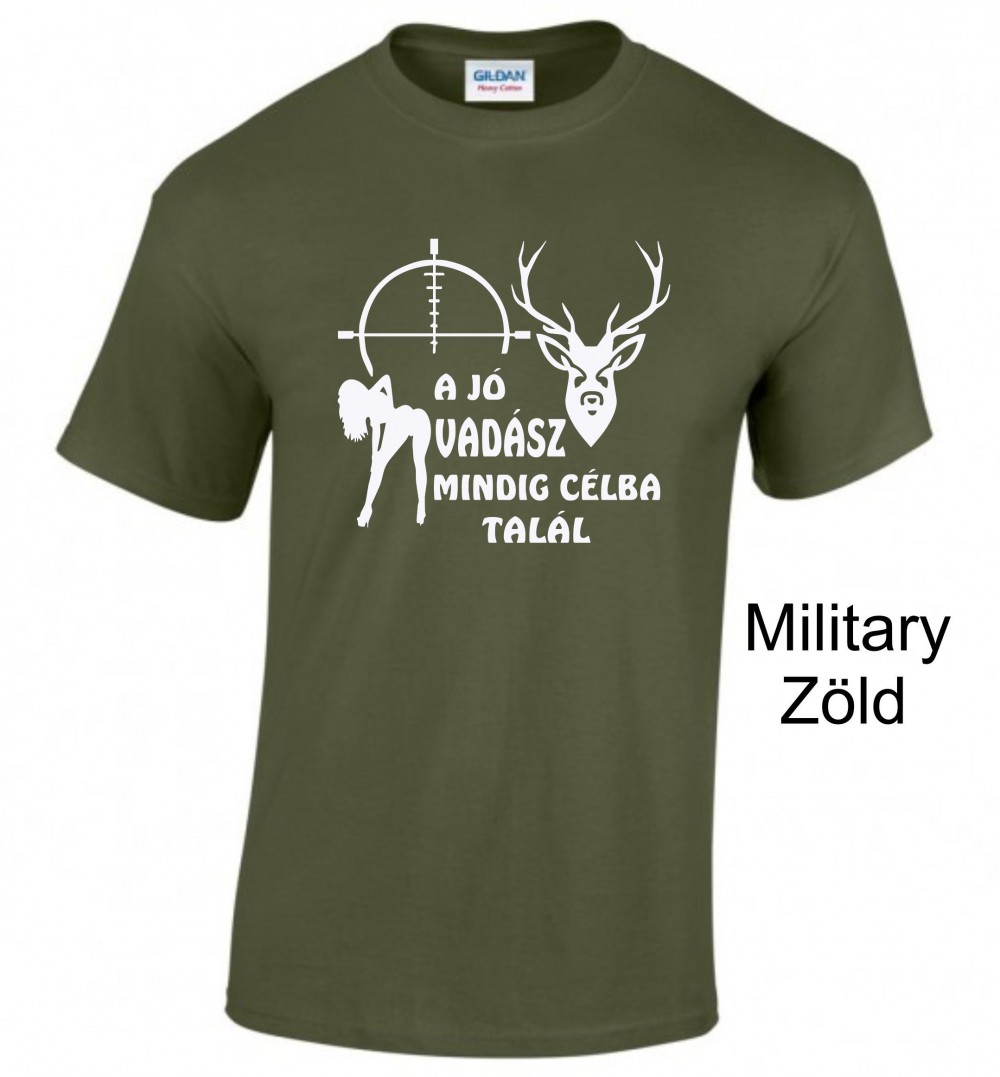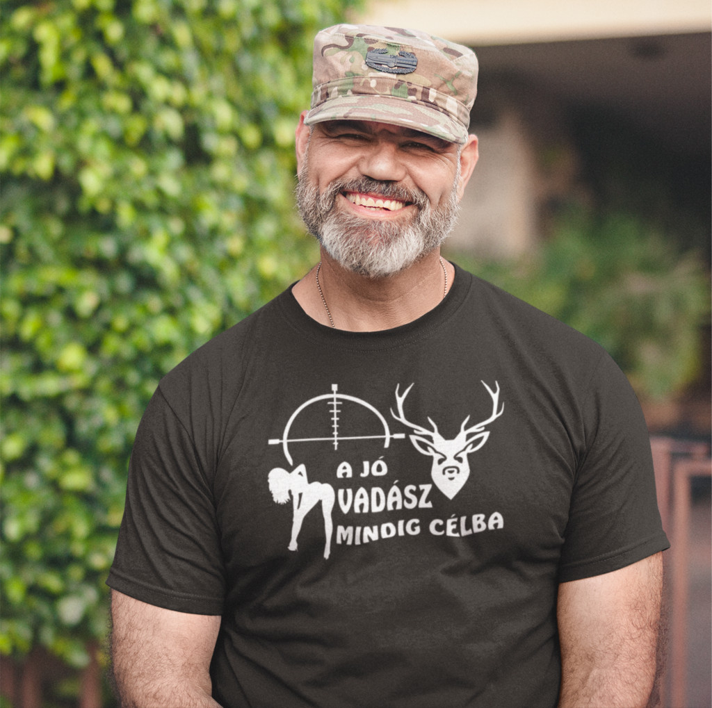 - Minta Típusa: "A jó vadász mindig célba talál" vicces felirat/grafika – Előny: Frappáns, humoros, de egyértelműen kommunikálja a céltudatosságot.