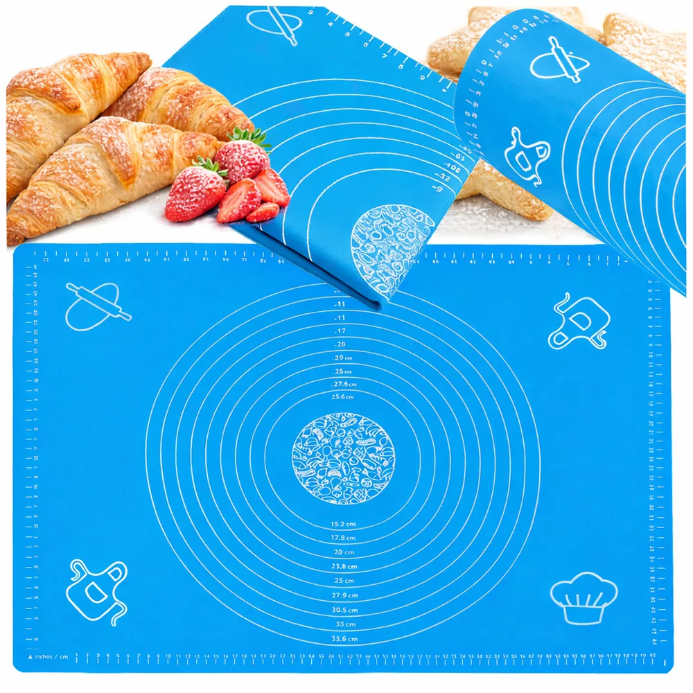 A jelölésekkel ellátott szilikon konyhai nyújtólap megkönnyíti a pontos méretek betartását.